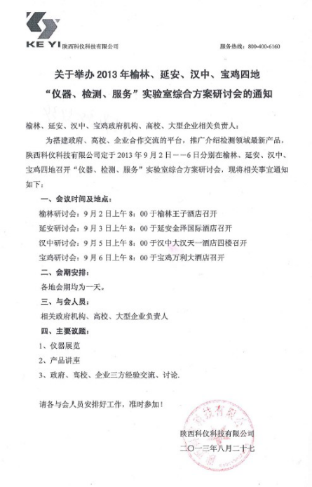 瀏覽次數(shù) :4862013年9月2日--6日我公司分別在榆林、延安、漢中、寶雞四地順利召開了“儀器、檢測(cè)、服務(wù)”實(shí)驗(yàn)室綜合方案研討會(huì),此次研討會(huì)分別通過(guò)現(xiàn)場(chǎng)儀器展覽、產(chǎn)品講座、技術(shù)交流為政府、高校、企業(yè)三方提供了很好的交流、討論平臺(tái),讓客戶對(duì)檢測(cè)領(lǐng)域的最新產(chǎn)品有了更多的了解,同時(shí)也加深了陜西科儀在各地級(jí)市的影響力!各地研討會(huì)現(xiàn)場(chǎng)... [查看詳情]