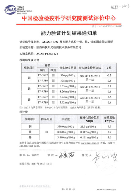 中國檢驗(yàn)檢疫科學(xué)研究院測試評價中心組織的ACAS-PT392嬰兒配方乳粉中銅、鐵、鋅的測定能力驗(yàn)證;