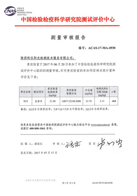 中國檢驗(yàn)檢疫科學(xué)研究院測試評價中心組織的鴨肉中的氯霉素測量審核;