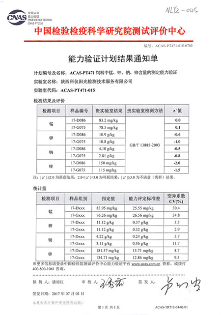 中國檢驗(yàn)檢疫科學(xué)研究院測試評價中心組織的ACAS-PT471飼料中錳、鉀、鈉、鋅含量的測定能力驗(yàn)證;