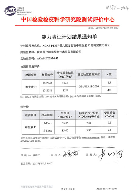 中國檢驗(yàn)檢疫科學(xué)研究院測試評價中心組織的ACAS-PT397嬰兒配方乳粉中維生素C的測定能力驗(yàn)證;