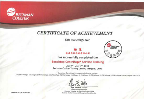2014年7月6日,經(jīng)過一周的學(xué)習(xí)培訓(xùn),我公司楊星、耿海龍2名工程師經(jīng)過貝克曼廠家考核,榮獲廠家頒發(fā)的售后服務(wù)資格證書,至此,我公司成為貝克曼西北地區(qū)的維修站點,我們將繼續(xù)努力,全新全意為每一位用戶服務(wù)。