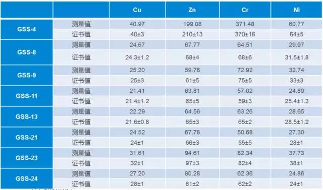 表 3. 土壤標(biāo)準(zhǔn)樣品元素分析結(jié)果(單位:mg/kg)