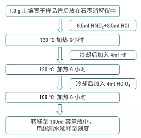 而此外更加嚴(yán)峻的挑戰(zhàn)是土壤成分對檢測的干擾問題。眾所周知,土壤基質(zhì)十分復(fù)雜,尤其含大量鹽類,并且不同地點(diǎn)、不同環(huán)境的土壤樣品,含鹽種類也會大相徑庭。使用原子吸收分光光度計(jì)檢測土壤樣品,通常要求“全消解”,即利用各種酸液,將樣品成分氧化分解,剩下的部分,不論組成,完全“融解”在酸液中。例如,硝酸主要用來氧化分解有機(jī)類成分,適當(dāng)加入雙氧水可促進(jìn)硝酸與樣品反應(yīng)。土壤含大量無機(jī)鹽成分,推薦使用鹽酸促進(jìn)消解;土壤中含硅酸鹽成分,需使用氫氟酸。
