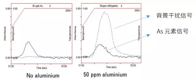 對此,我們先看一個極端的例子:圖 3 顯示為 30 ppb 的 As 元素在無基體和高背景干擾下的石墨爐測定對比。在近 50 ppm 鋁鹽帶來的近 0.6 ABS 的高背景下,痕量的元素依然能準(zhǔn)確測定。